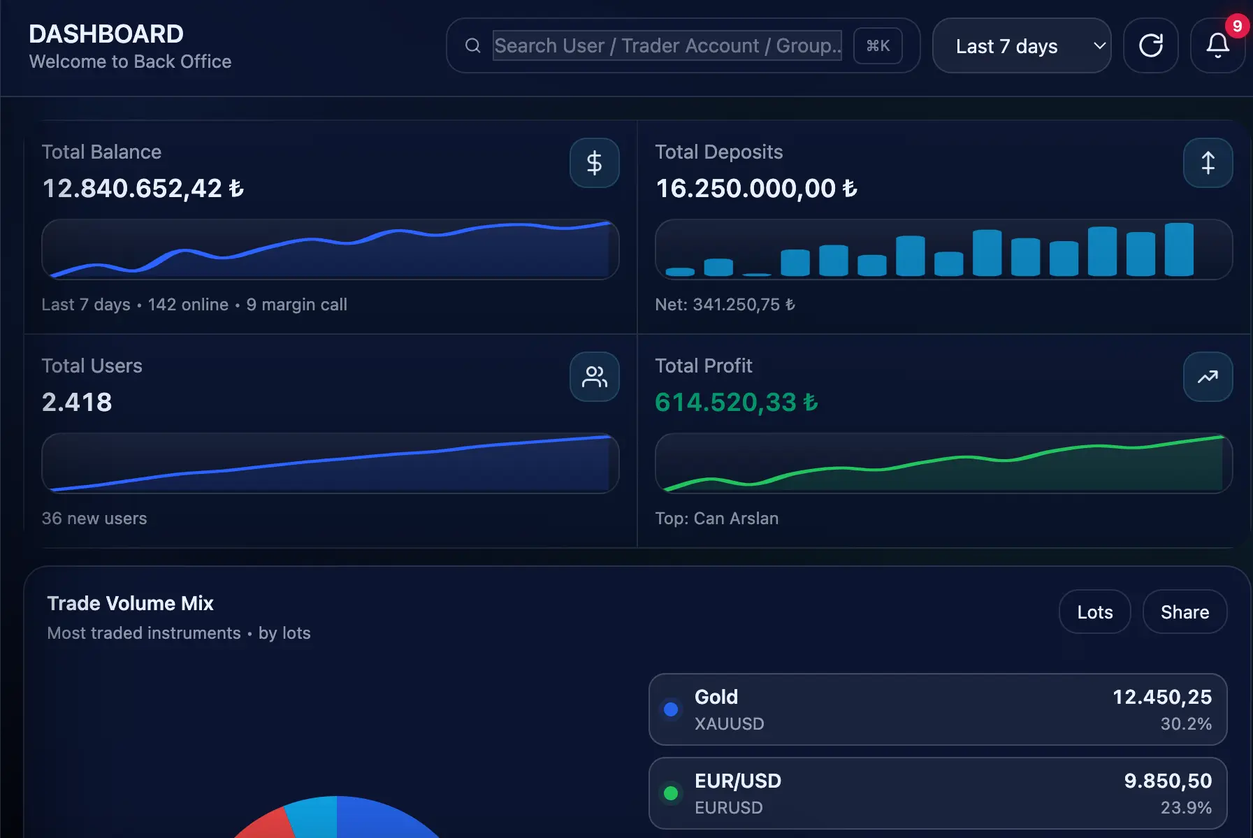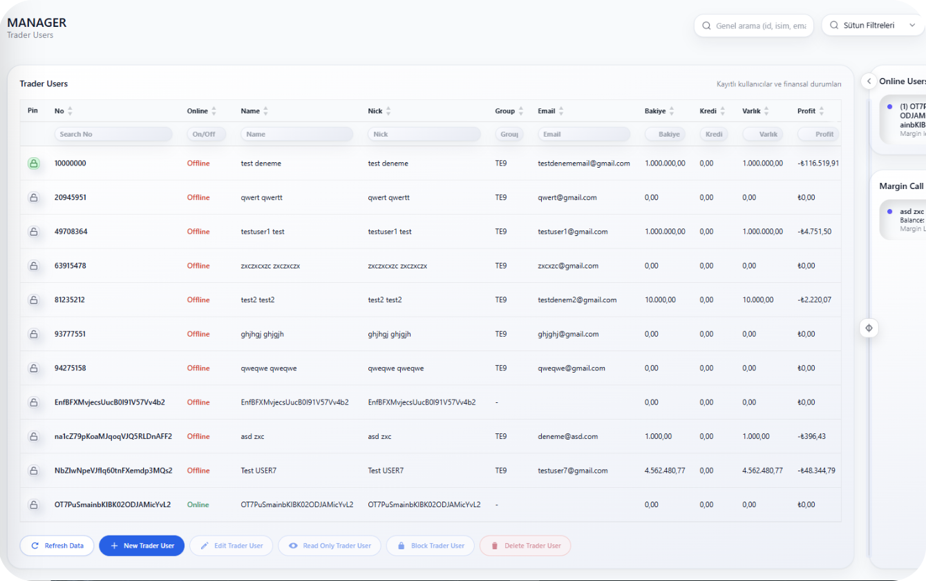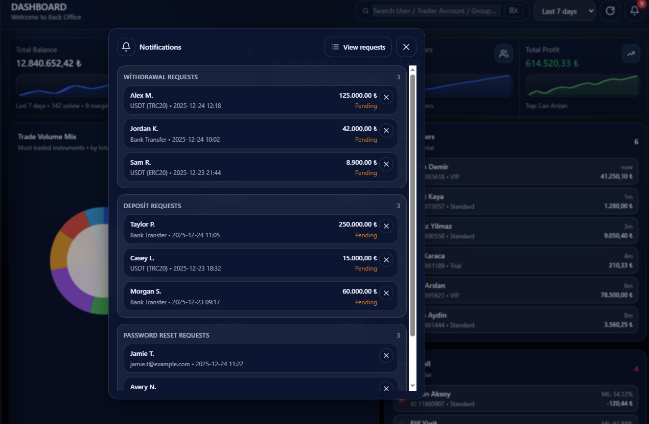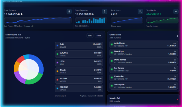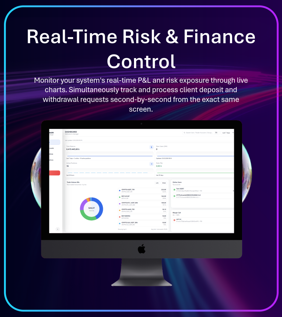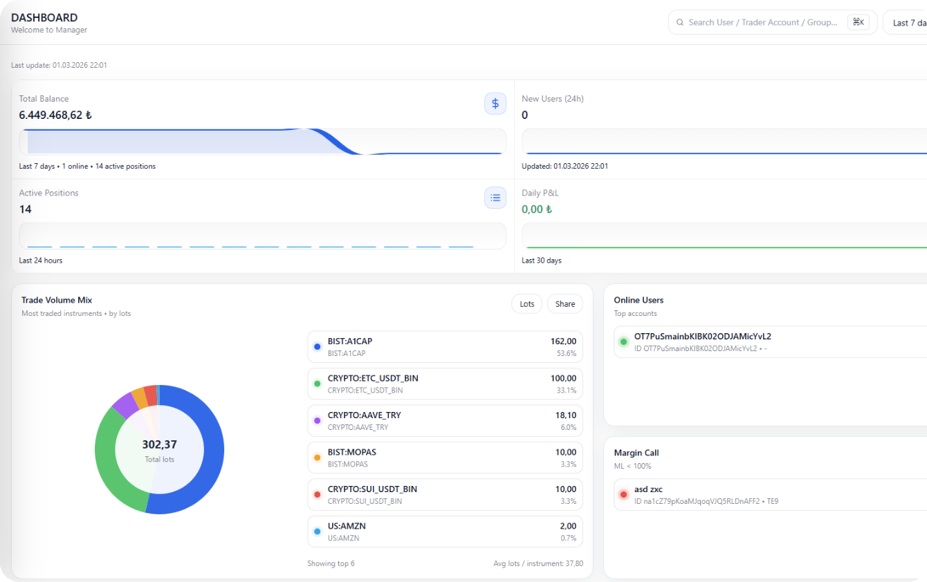 Get a real-time pulse on your business. Monitor total system equity, active users, live trade volumes, and instant margin call alerts—all on one intuitive screen.