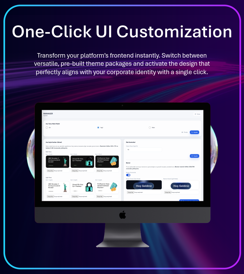 Transform your platform’s frontend in seconds. Apply pre-built themes and align the design perfectly with your corporate identity using just one click—no coding required.